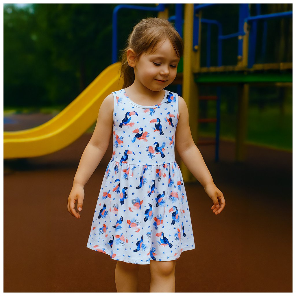 Dívčí bílé šaty s barevnými papoušky. ♥