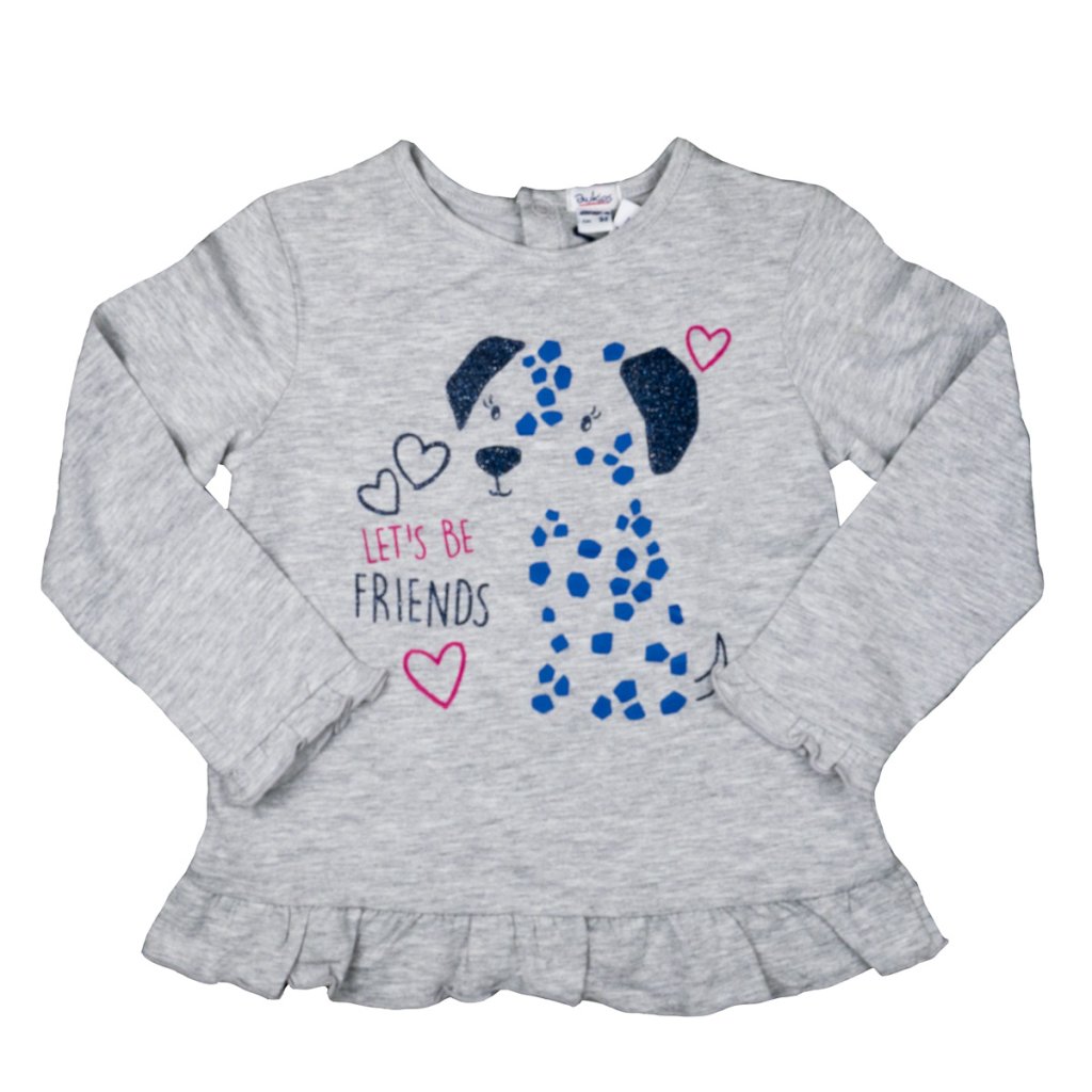 Dívčí tričko s dlouhým rukávem v šedé barvě a obrázkem pejska. Vzadu zapínání u krku na patentky.