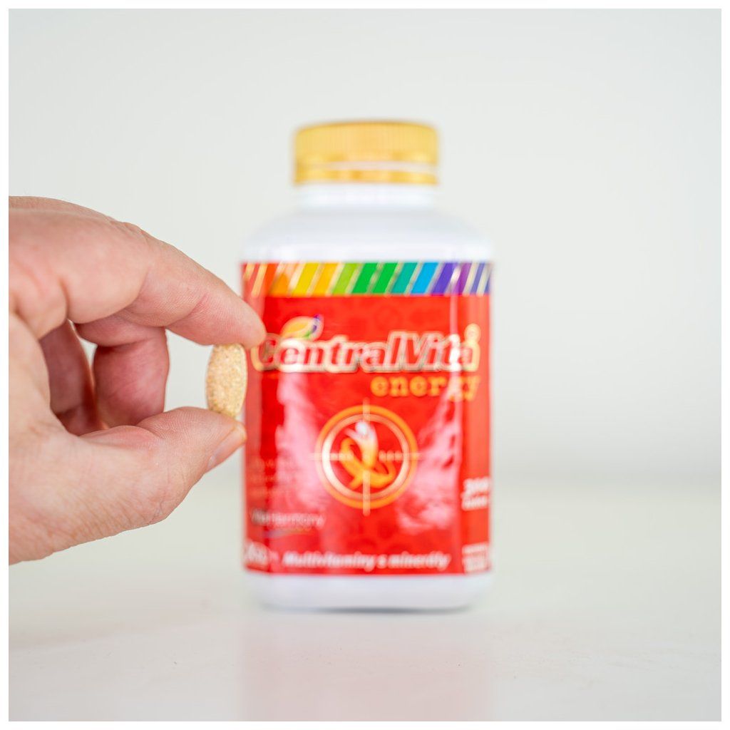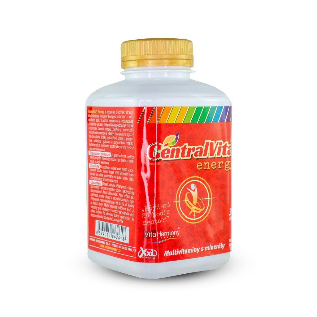 CentralVita® Energy - vyvážená formule obsahuje celkový komplex vitaminů a minerálních látek. Biotin ze skupiny vitaminů B přispívá k psychické činnosti a činnosti nervové soustavy. Hořčík napomáhá k elektrolytické rovnováze, která hraje důležitou roli ve vyváženém příjmu tekutin a roztoků solí a minerálních látek. Chróm přispívá k normálnímu metabolismu, vitamin C napomáhá funkci obranyschopnosti a zinek udržuje vlasy a nehty. Nová receptura je obohacena o přírodní standardizované rostlinné extrakty guarany, ženšenu, ginkga a echinacei. Ginkgolidy Jinanu dvoulaločného působí na rozšiřování cév očí, mozku i končetin. Guarana obsahuje kofein s účinkem na svalový a nervový systém. Ženšen působí při stresu a napomáhá k celkové stabilitě.